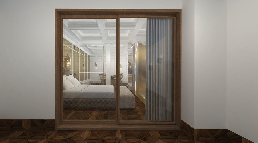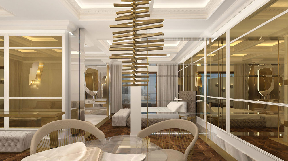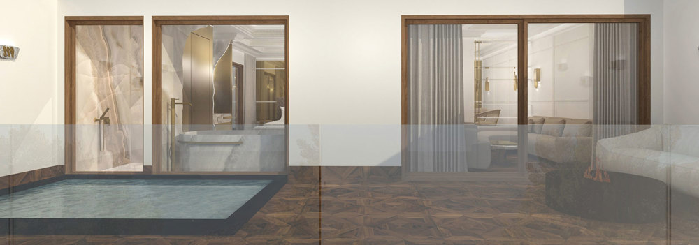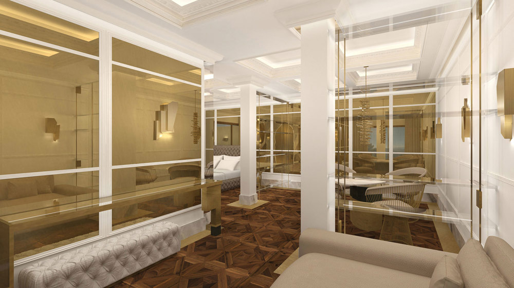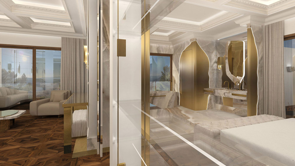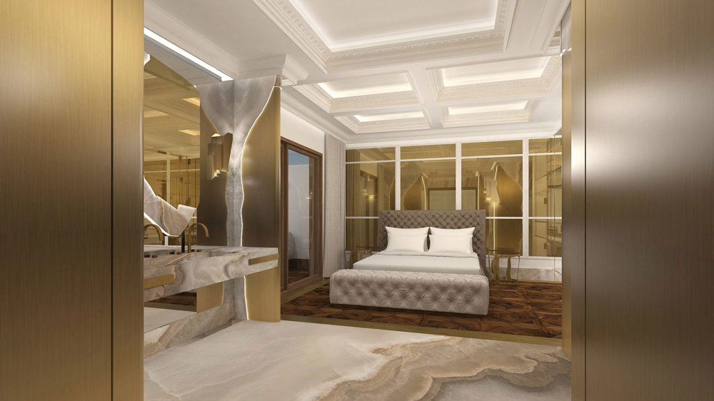 Luxurious bedroom with tufted bed, marble flooring, and golden decorative panels in Royal Golden Suite