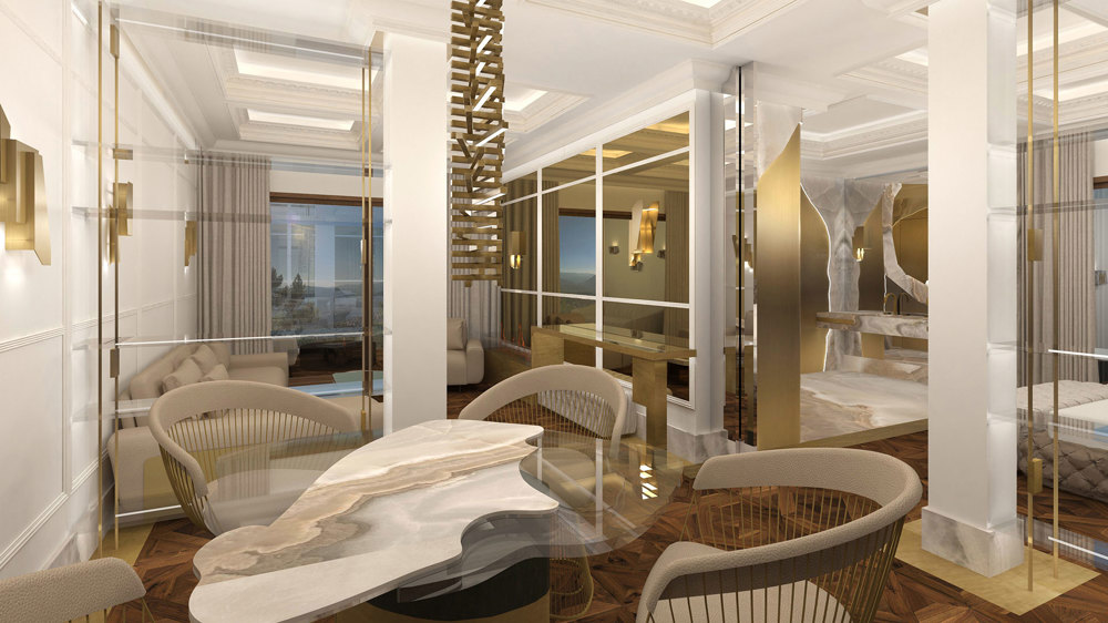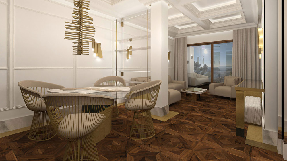 Sophisticated dining area with marble table, gold-accented chairs, and modern lighting beside a cozy lounge