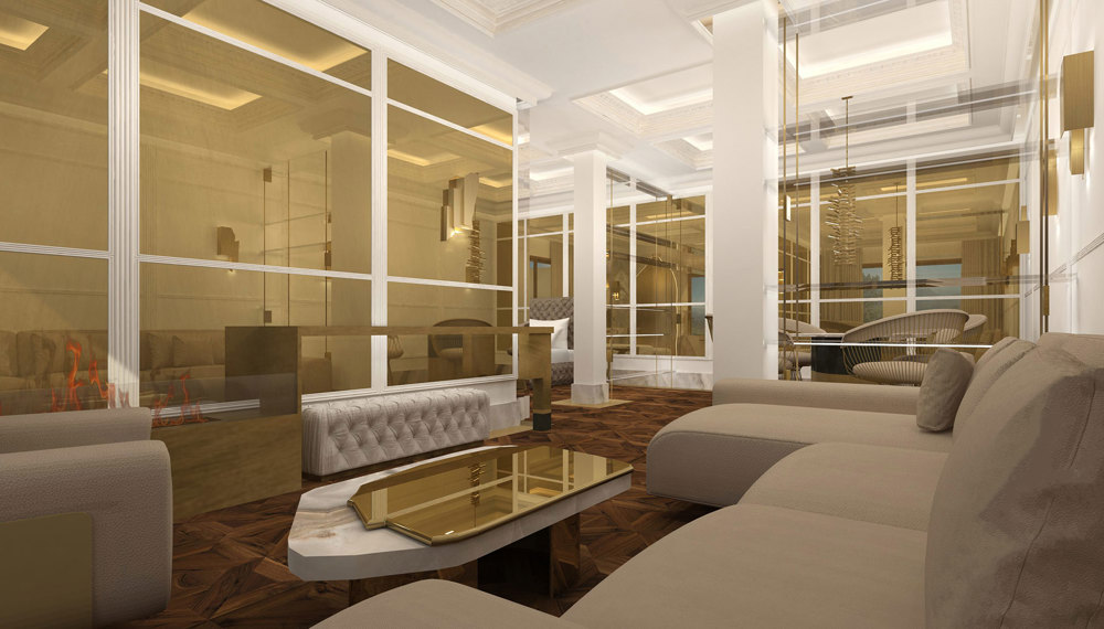 Elegant living room with beige sofas, marble coffee table, and golden wall panels reflecting warm light